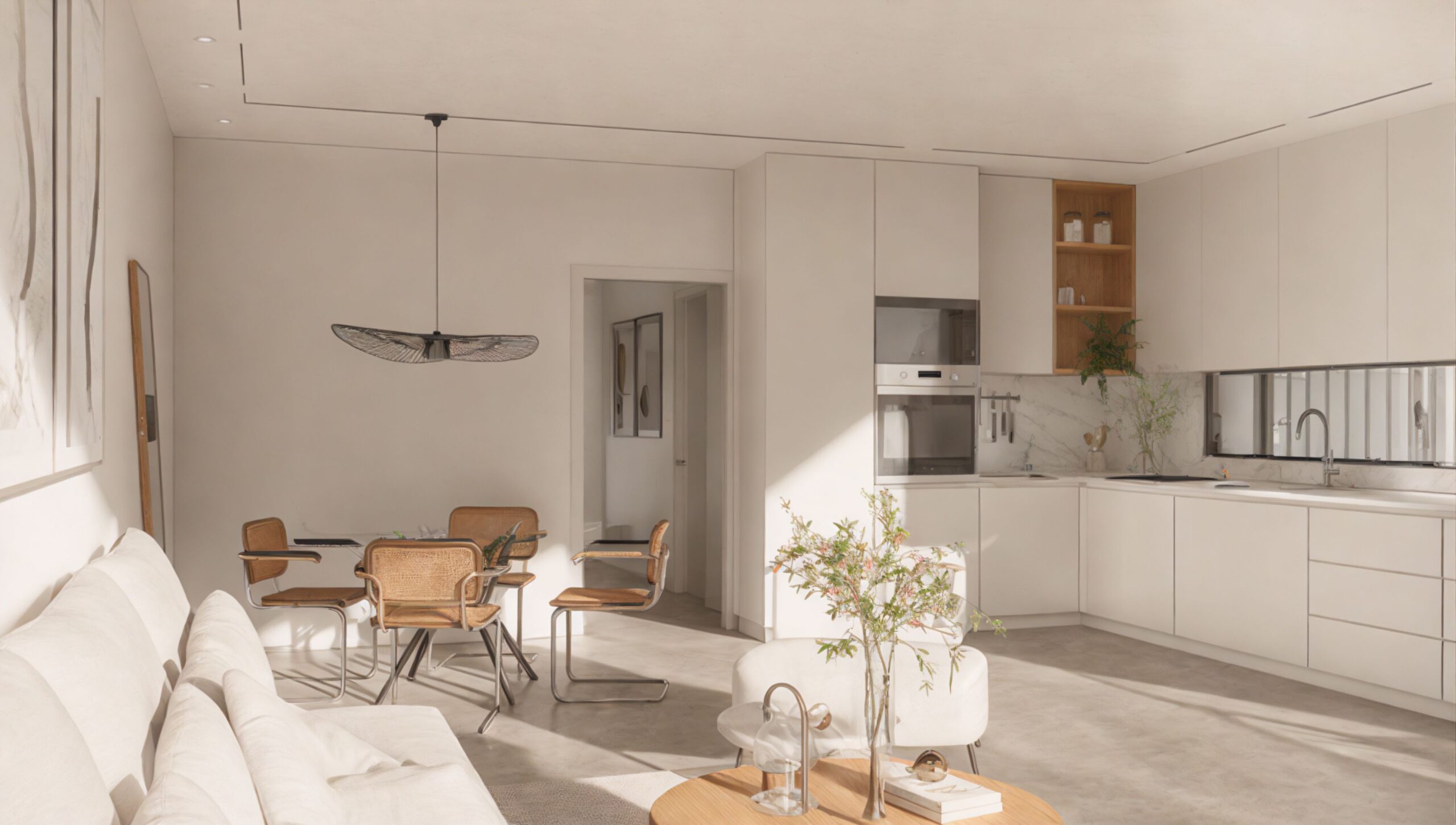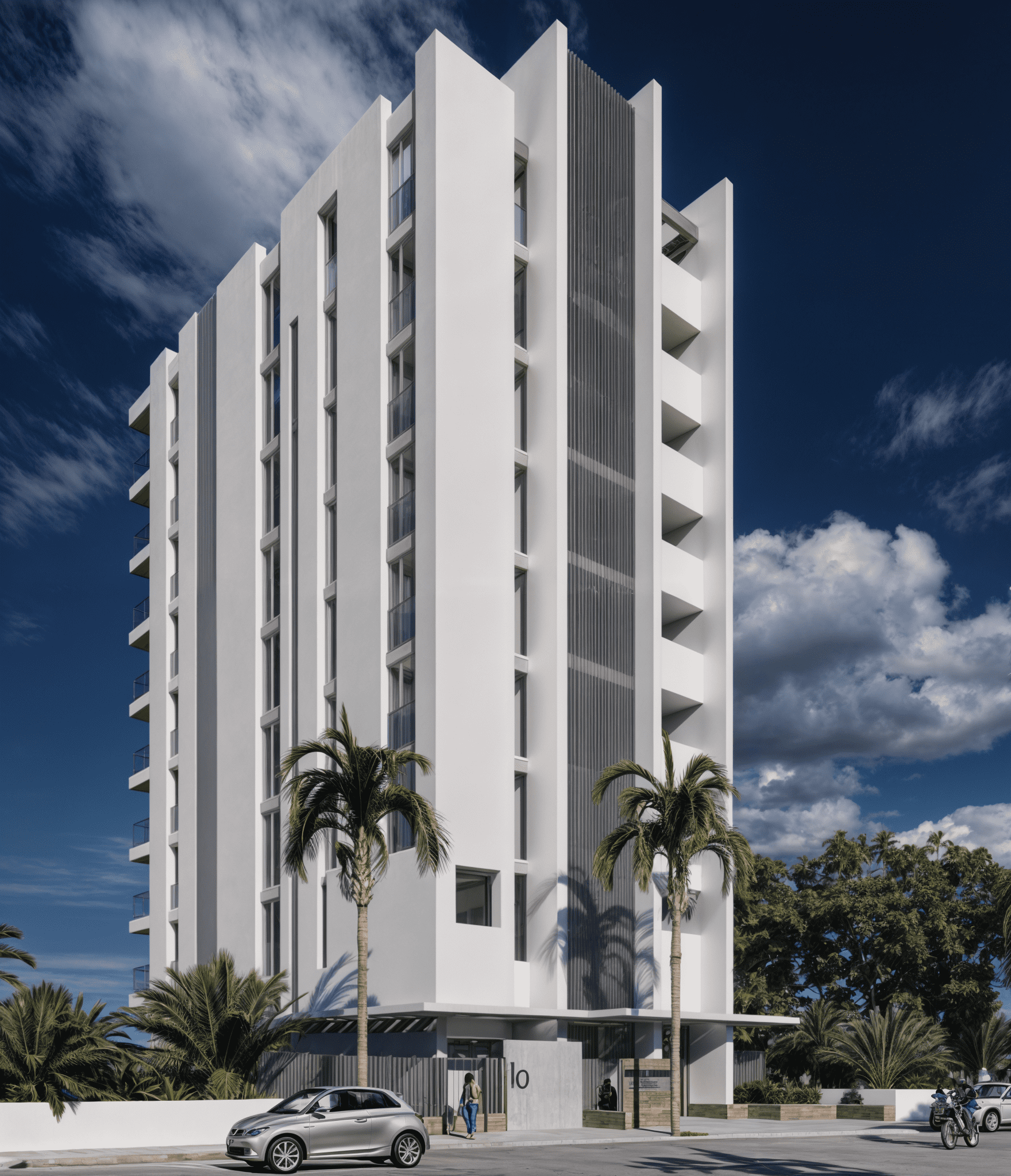 El edificio que se encuentra en primera línea de playa en Calpe es una estructura de ocho plantas con catorce viviendas, que hemos diseñado cuidadosamente para integrarse armónicamente con el entorno urbano circundante y ofrecer una experiencia única en la costa mediterránea.